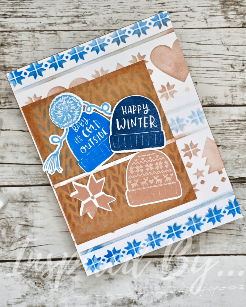 I was first inspired by the lovely photo. I love knit hats and especially in the Winter. I don’t own a knit hat with these colors but now it’s on my wishlist. Next, I was inspired by the card Sketch. I love the simplicity of it. On my card, I used 2 stencils from A Colorful Life Designs (use VonFan10) called Scandinavian Quilt 6×6 and I ink blended this stencil first for my background using white cardstock with Pinkfresh Studio ink cubes in Blue Jay, Warm Buff, and Slumber. Next stencil I used Cozy Knit 6×6 and used Blue jay and Warm Buff inks on Kraft cardstock. I trimmed both my background and Kraft cardstock. My background is 4 1/4 x 5 1/2. I placed a strip of white stenciled cardstock in the center of my Kraft to mimic the card sketch.