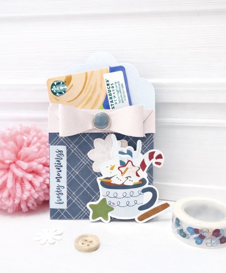 You can find the link to the gift car holder here and I used Lori Whitlock’s Echo Park Winter Fun Collection to create it with. That little snowman soaking in the hot chocolate is just too cute.
