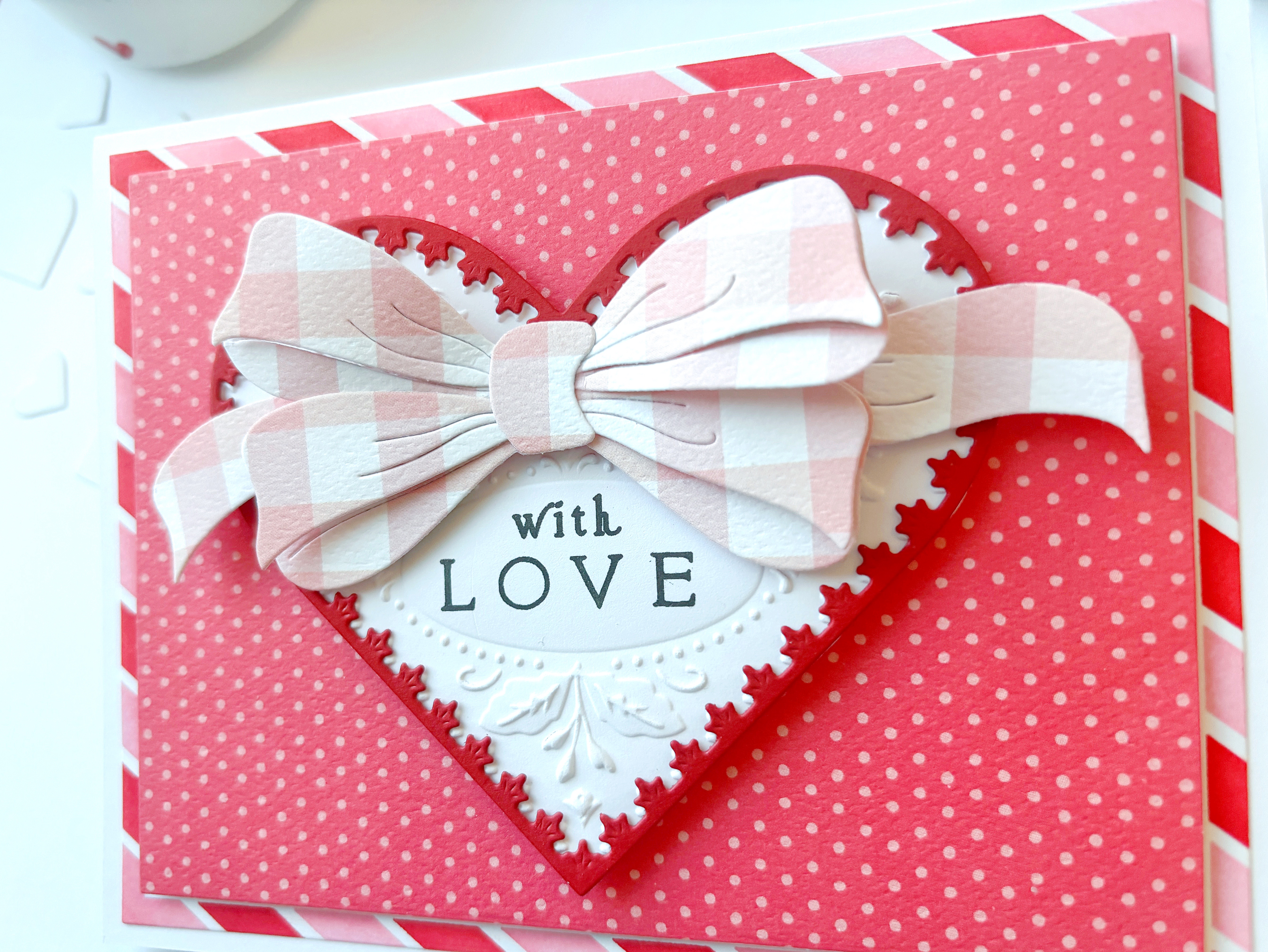The heart was made with The Greetery’s “Whole Hearted” die, embossed with the “Coquette Hearts” 3D embossing folder, then bordered with a red “Filigree Heart.” Stamped a “Simple Valentines Sentiment” then added a “Big Beautiful Bow” in pink gingham!