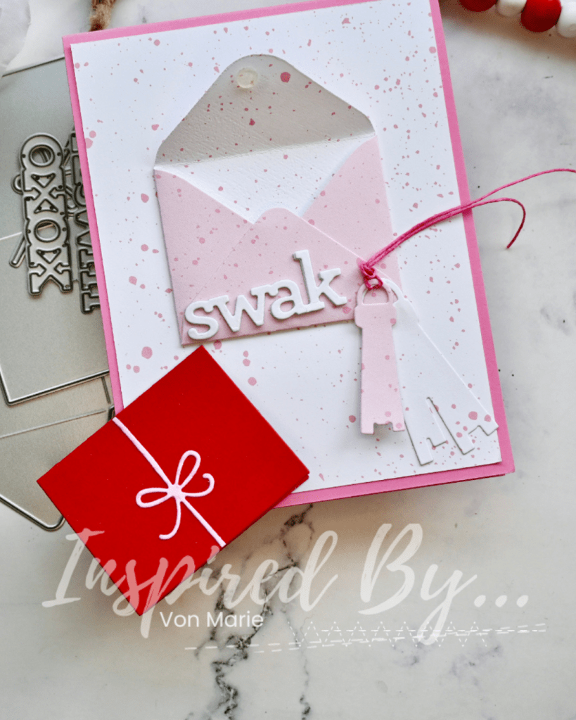 I chose to use My Monthly Hero Kit January 2026 Happy Mail. It had this cute envelope die and small card die to tuck in the finished envelope. It also has 2 heart dies and a this cute bow so I used those also. My pattern paper is from Lawn Fawn Spiffy Speckles Strawberry Frosting, I have some 12×12’s of it. It’s also double sided which is perfect. I also used red cardstock and Doodlebug hearts pattern paper.