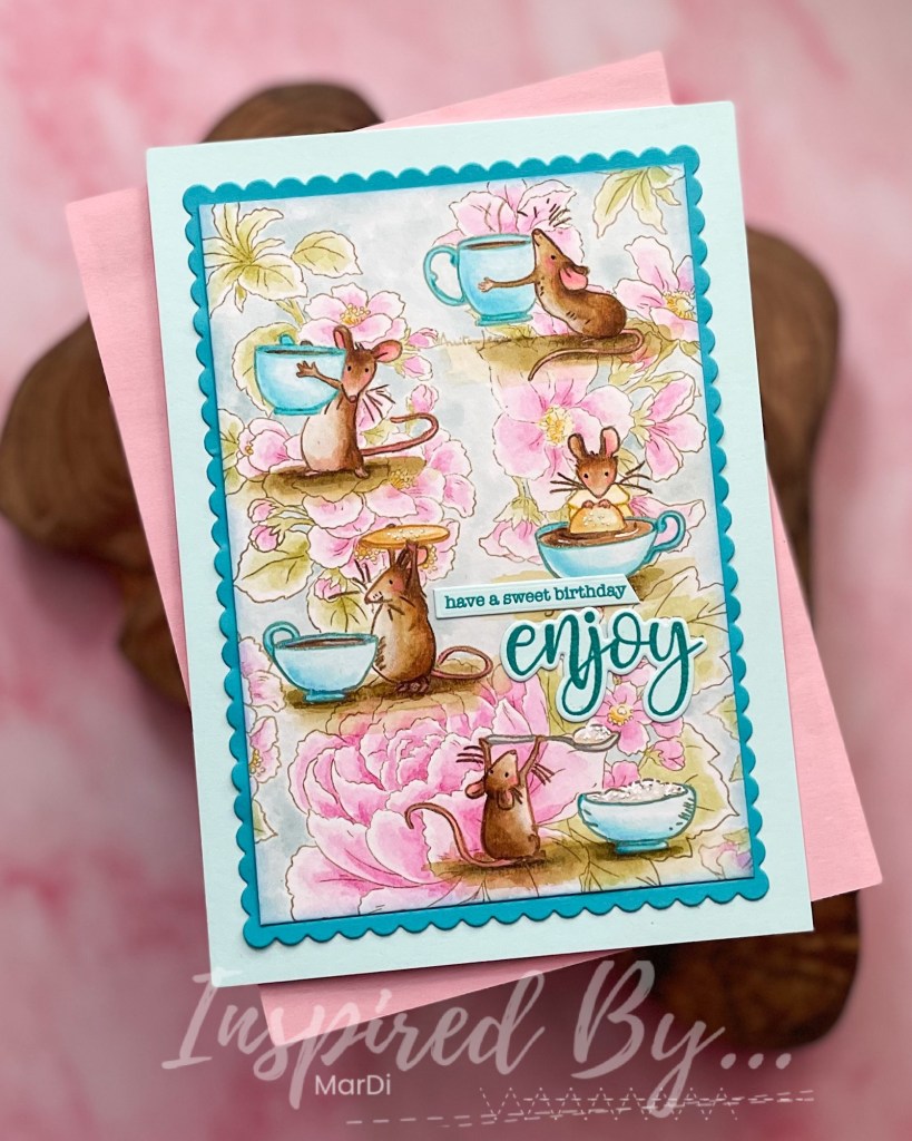 I love the inspiration for this week’s Inspired By challenge. There’s something so charming about tea time in the garden. It was fun combining this cute Colorado Craft Co Tea Time Fun mice set with the lovely Altenew Delicate Garden set to create this A7 card. Once again, I used watercolor and colored pencil for my coloring media.