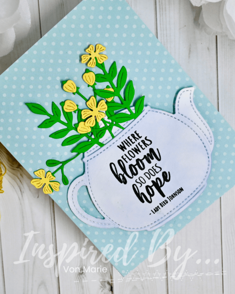 I used Lawn Fawn Stitched Teapot Dies for my Teapot Planter. I cut it out with white heavyweight cardstock and then ink blended my teapot and handle with Catherine Pooler Stone Blue dye ink. I cut out my flowers with Spellbinders Simply Perfect layered Blooms and Sealed Blooms die sets using The Paper Insider for the yellow and green cardstock. I glued my stems and flowers using liquid glue and arranged them in my teapot planter to my liking. I then placed all in my stamping platform and inked a sentiment from Spellbinders Fragrant Flowers Stamp Set with Versafine Onyx Black ink.