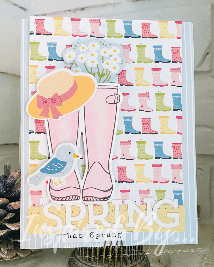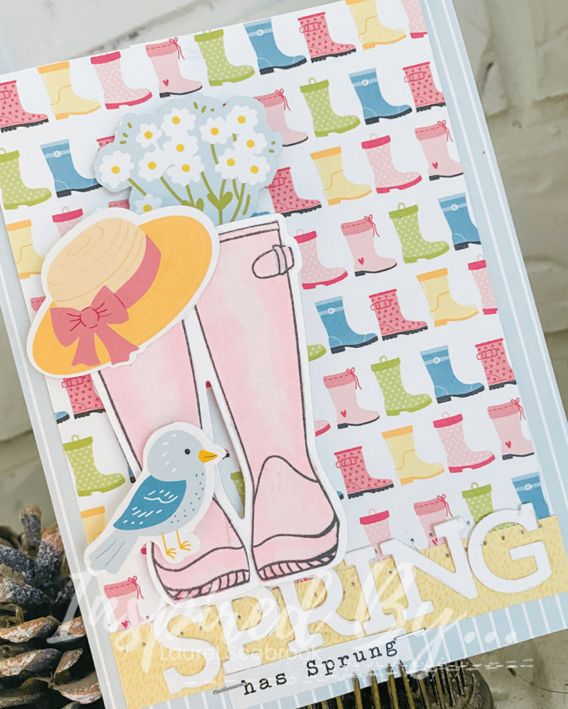 The gum boots stamp is from CTMH and believe it or not, I have some pink ones like this, some baby pink Hunter boots…. I mounted all the images on foam squares for some dimension. The Spring die is from Echo Park as well. I pretty much always, as I have done here, adhere my stickers to scrap paper and fussy cut out as I prefer die cut elements.