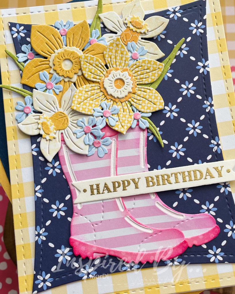 Living in the California desert, we don’t typically need rain boots. At first I was concerned that I may not have anything in my stash to match the theme but when I went searching, I was delighted to find a number of items. I decided to go with the Spellbinders RAIN BOOT BOUQUET small die of the month from February 2024. I continued with mission to use my patterned paper stash, although the pattern is so subtle in the pale yellows and blues that it’s difficult to see it. Since I am constantly in need of birthday cards, I added a simple Happy Birthday sentiment to finish off my card.