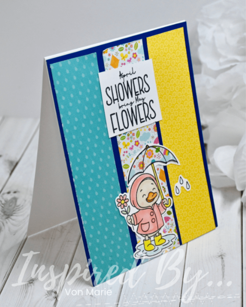 Next I stamped this cute duck in Memento Tuxedo Black ink on white cardstock. I love it from the Not 2 Shabby Shop called Rainy Day Cheer that was from a Subscription Box Of The Month or Jr Box Of The Month. I colored it in trying to match the inspiration photo using Copic Markers. I paper pieced the umbrella from one of the same pattern papers and used a black marker to clean up my edges. I kept my duck light colored for a neutral look. I fussy cut the duck and water droplets leaving a white border. Isn’t this duck having so much fun? Makes me smile. I stamped a sentiment from the same stamp set and cut it to fit. All was glued to a top folding A2 card base. I love this card and challenge.