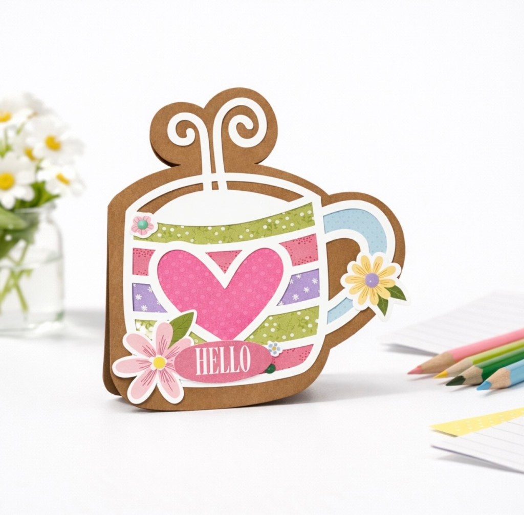 I love how the soft kraft base gives it the look of a warm cup of cocoa or coffee in the morning. A simple Hello sentiment felt perfect-just like meeting a friend for coffee and your favorite little cafe.