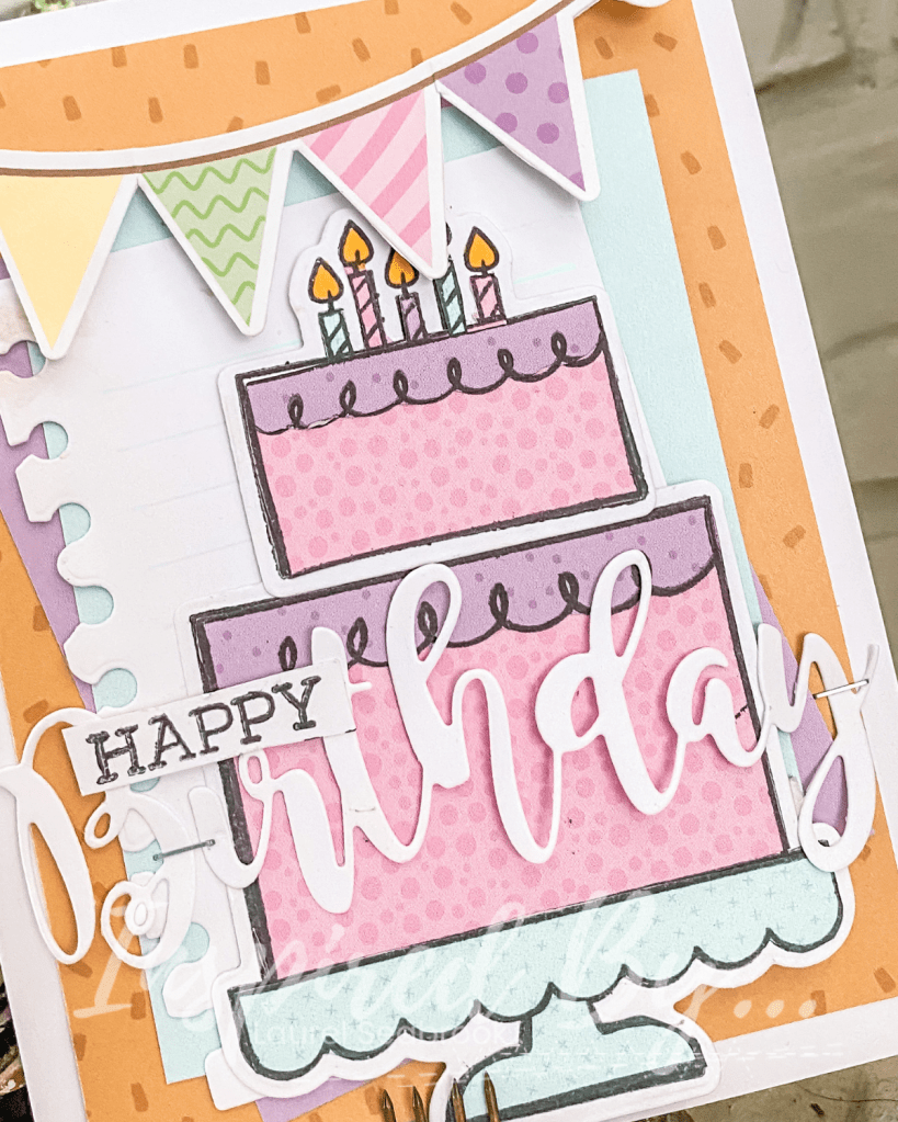 The Cake stamp and die is from CTMH one and I paired it with a notebook stamp and die from Stampin Up. I paper pieced the cake and mounted it on foam squares. I then topped it with the birthday die from Echo Park. This was one of those 11th hour type of cards and luckily for me, it all went together well.