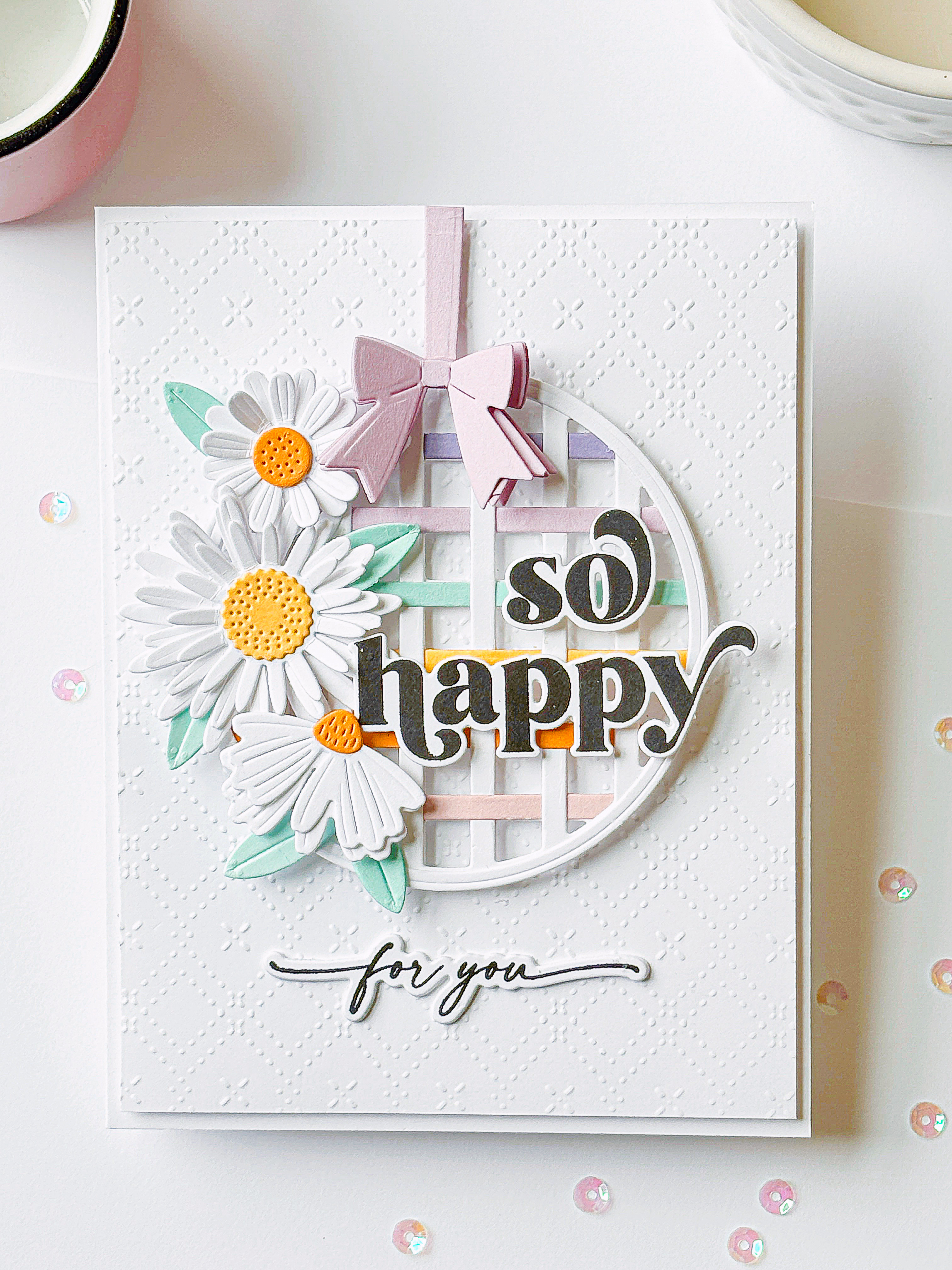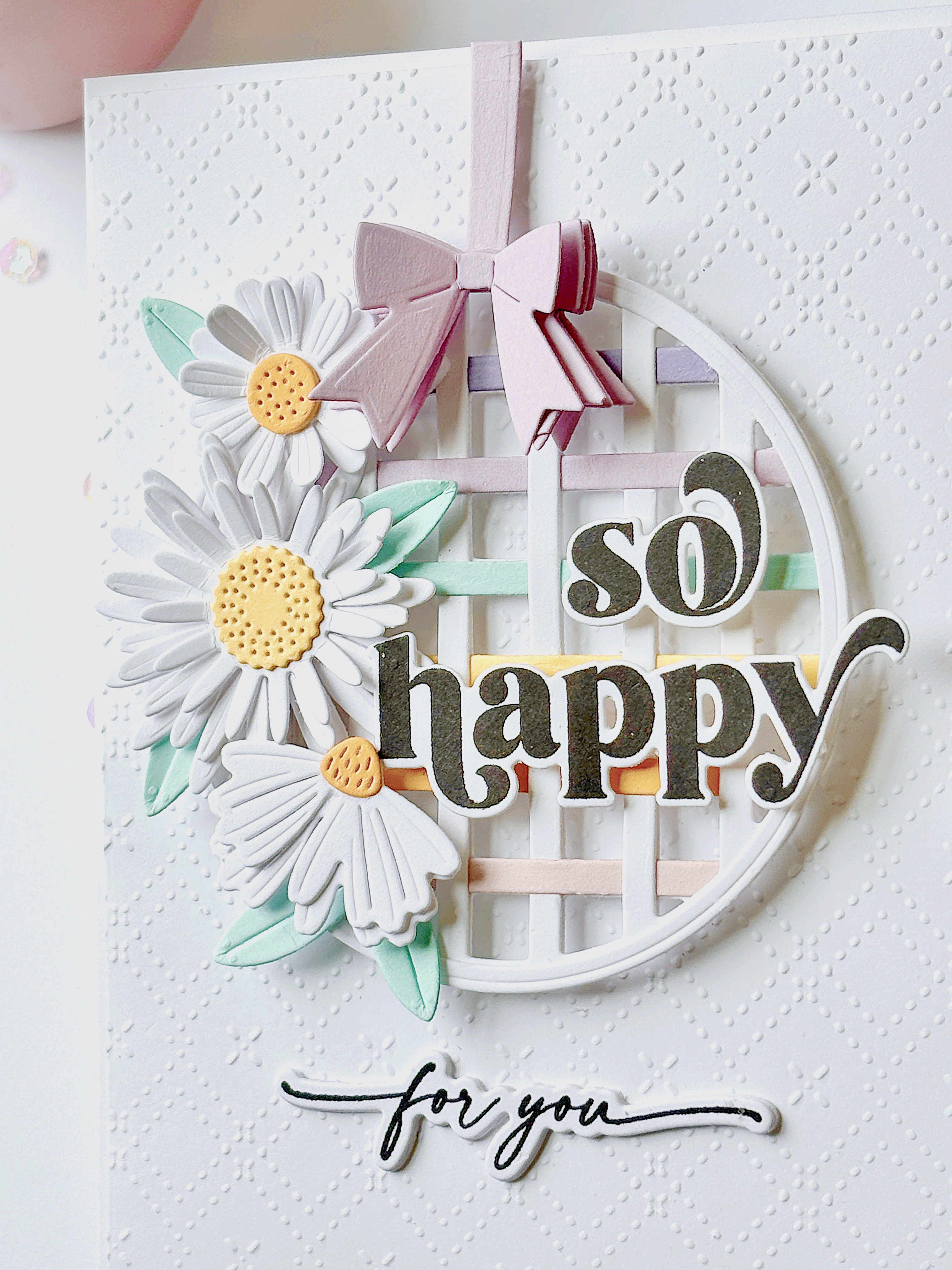 I had the perfect background to use for this week’s challenge, Papertrey Ink’s “Spring Basket.” The die set includes a full basket die, but also one with an open weave so you can add your own colors. I added pastels and topped it with a stacked lavender bow. The “Into the Blooms: Daisies” dies framed my basket’ on one side,