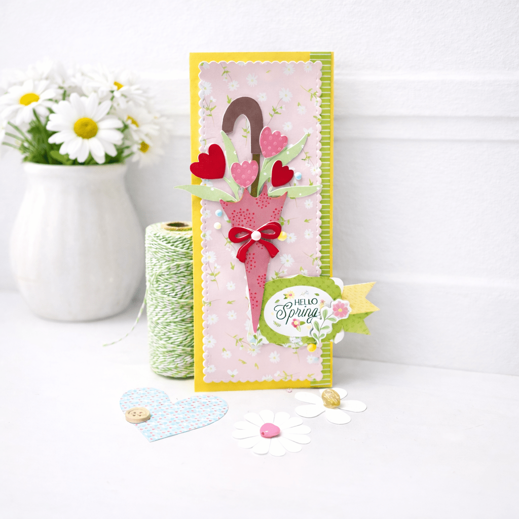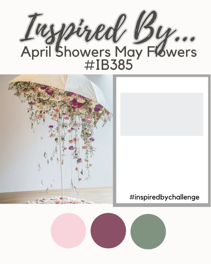 This week’s Inspired By Challenge is a beautiful reminder that April showers bring May flowers! This dreamy umbrella overflowing with cascading blooms creates a soft, romantic scene full of delicate movement and elegant detail. The hanging florals, gentle color palette, and sparkling raindrop accents bring together the perfect blend of springtime freshness and whimsical charm.